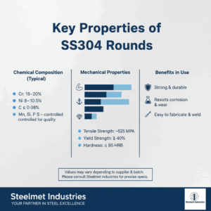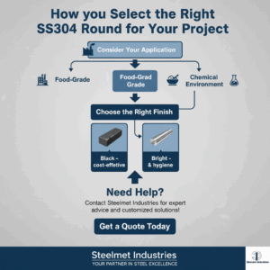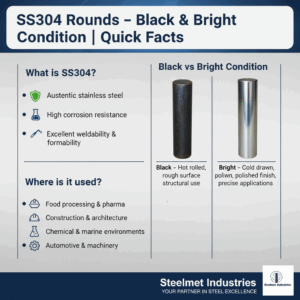 For accurate material selection and supply of SS304 rounds in black or bright condition, reach out to Steelmet Industries. Our technical team is ready to assist you.